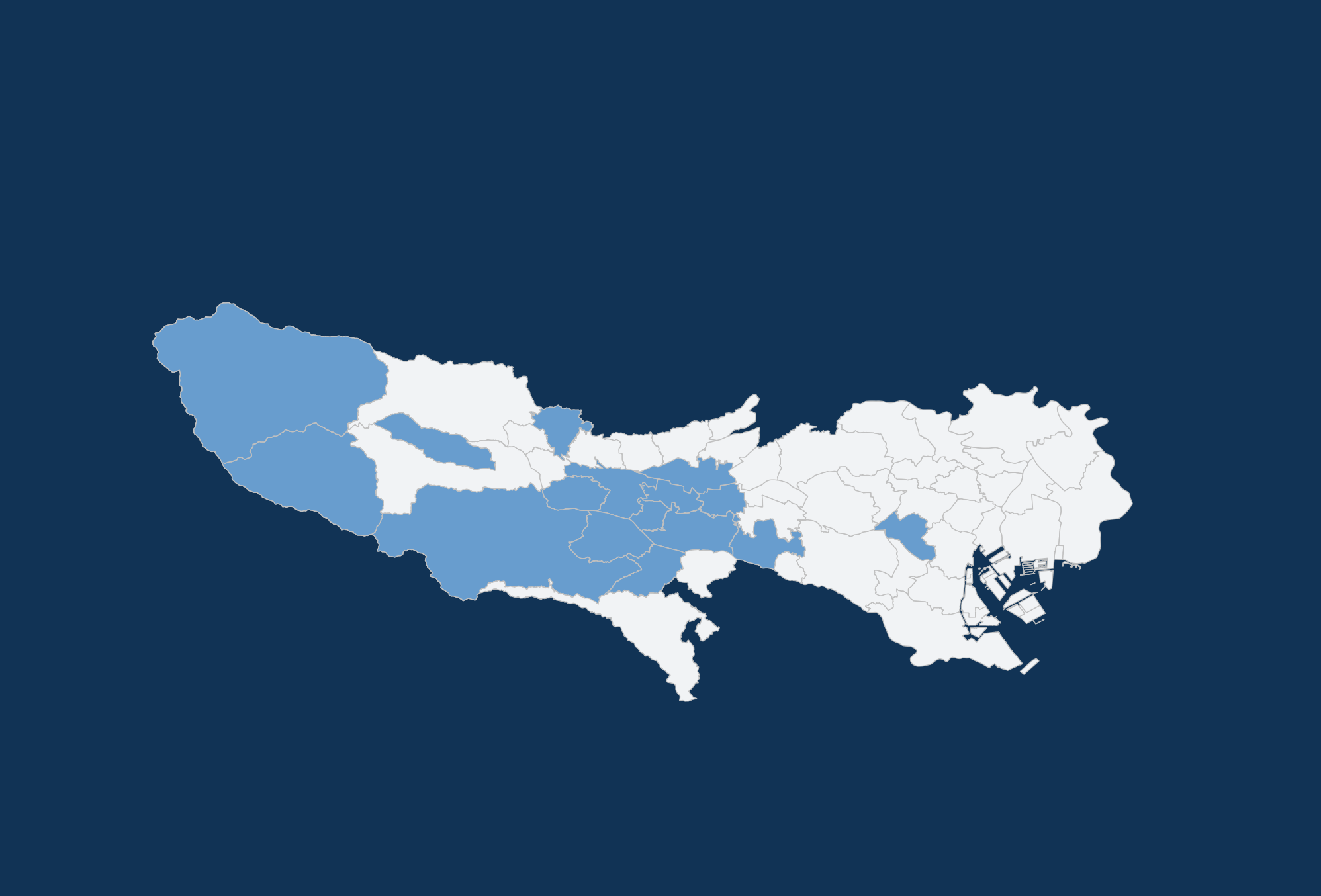 東京都:昭島市、国立市、小金井市、国分寺市、小平市、渋谷区、立川市、多摩市、調布市、西多摩郡奥多摩町、西多摩郡日の出町、西多摩郡檜原村、西多摩郡瑞穂町、八王子市、日野市、府中市